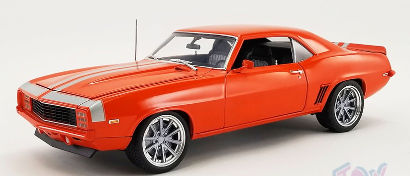 Acme - 1969 Chevrolet® Camaro® Restomod. 1:18 scale die-cast collectible model. This Chevy® Camaro® is a 10.25"L x 4"W x 3"H diecast metal car with openable doors, hood, and trunk. This '69 Camaro® is manufactured by Acme. Individually packed in a decorated box. Box size: 12.5"L x 6.25"W x 4.75"H. Item A1805720 is in HUGER ORANGE