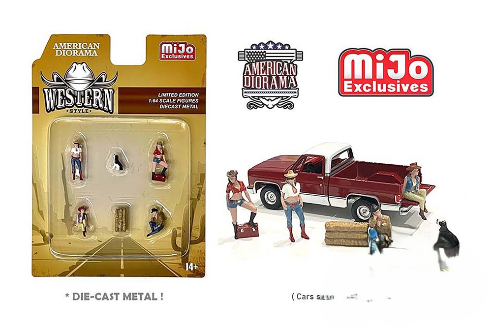 American Diorama/Mijo Exclusives - Western Style Figure Set. Scaled for 1:64 scale model cars or 1:64 scale dioramas. This exclusive Multipack includes: 4 Figurines and 2 Accessories. Limited Edition. Die Cast Metal. Card size: 5.5"W x 7.5"H.