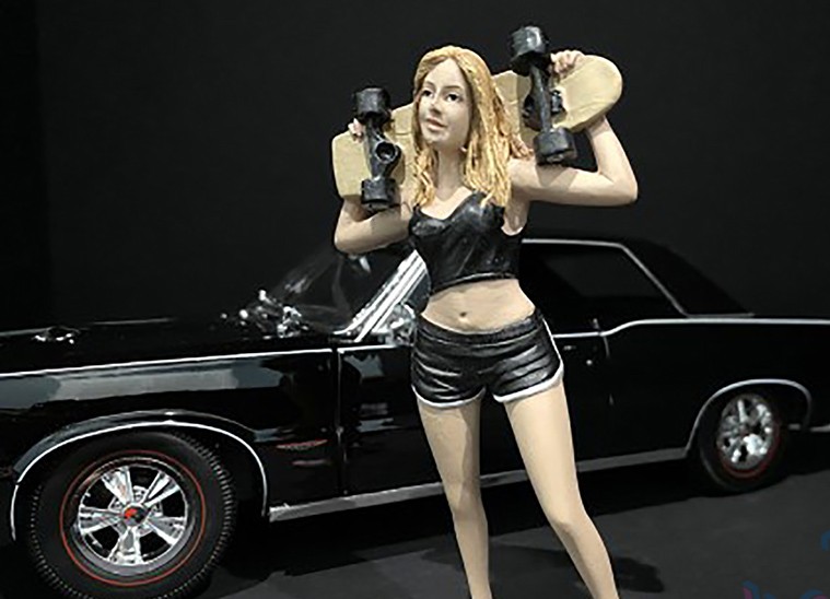 American Diorama Figurine - Skateboarder Figure I. 1:18 scale female figure in black shirt and black shorts. Hand painted cold-cast resin. This 4"H figure is great for decorating 1:18 scale cars, auto body shop and dioramas. Manufactured by American Diorama. Individually packed in a blister card. Card size: 5" x 8.5". Note: Vehicle is not included.