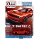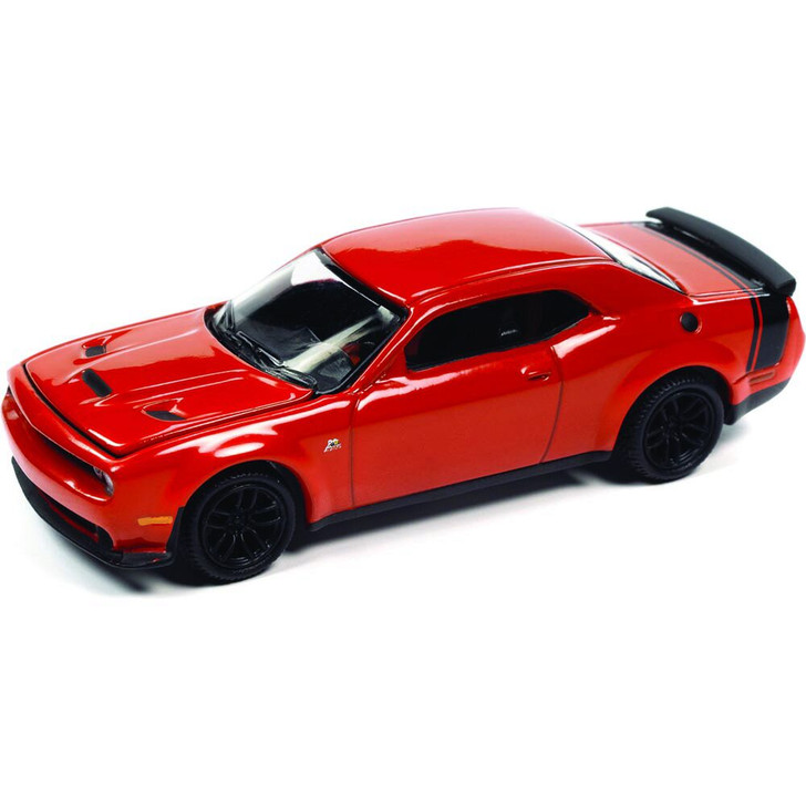 1/64 scale diecast car model of 2019 Dodge Challenger R/T Scat Pack Tor Red with Black Tail Stripe "Modern Muscle" Limited Edition die cast model car by Auto World. Brand new box. Real rubber tires. Has opening hood. True-to-scale detail. Detailed interior, exterior. Comes in a blister pack. Officially licensed product. Die-cast metal body and chassis. Dimensions approximately L-3 inches long.