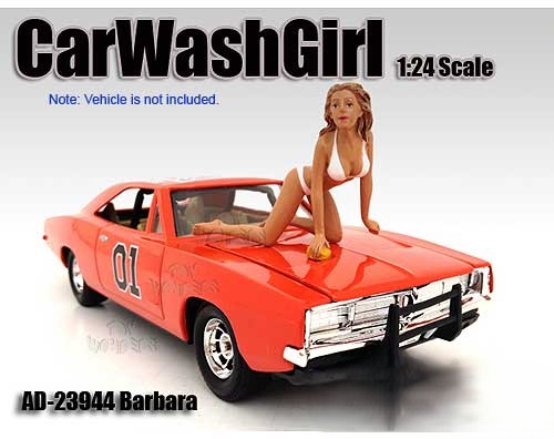 American Diorama Figurine - 1:24 scale Car Wash Girl Barbara Figure in WHITE. Hand painted poly-resin material. This 2" figure is great for decorating 1:24 scale cars and dioramas. Manufactured by American Diorama. Individually packed in a blister card. Card size: 3.75" x 7.5". Note: Vehicle is not included.