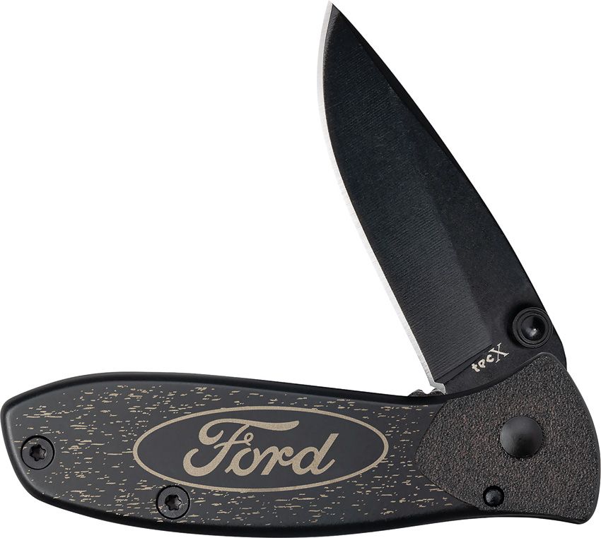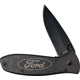 3.75" (9.53cm) closed. 2.75" (6.99cm) black coated stainless blade. Black finish stainless handle. Thumb stud. Pocket clip. Ford handle embellishment. Boxed.
