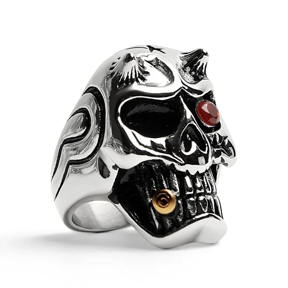 Stainless Steel Devil Skull With Red CZ Eye Smoking 18K Gold PVD Coated Cigar Ring, the perfect way to show your dark side. Made of high-quality stainless steel and 18K gold PVD Coated, features a devil skull design with a red cubic zirconia eye. It's the perfect ring for anyone who loves smoking cigars or who just wants to show off their edgy style.