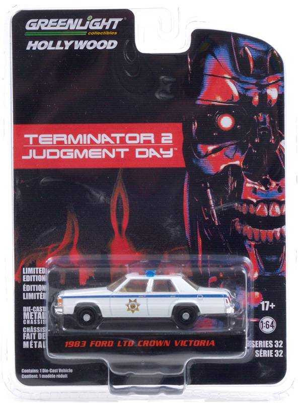 Greenlight Hollywood Series 32 presents the 1983 Ford LTD Crown Victoria Police Car from the movie Terminator 2 Judgement Day. A 1:64 scale diecast Limited Edition featuring die-cast metal body and chassis with rubber tires.
