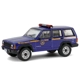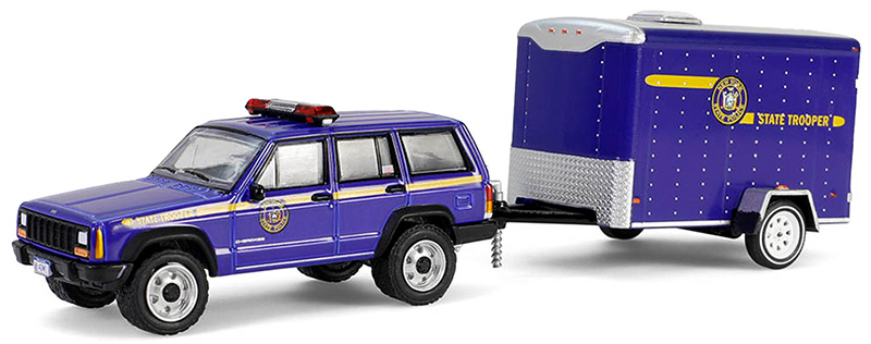 - 1/64 scale diecast car models of 2001 Jeep Cherokee "New York State Police" Blue with Yellow Stripes and Small Cargo Trailer "Hot Pursuit Hitch & Tow" Series 1 die cast model cars by Greenlight.