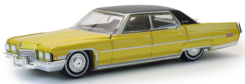 1/64 scale diecast car model of 1971 Cadillac Sedan Deville Lowrider Gold Metallic with Black Top "California Lowriders" Series 7 die cast model car by Greenlight.