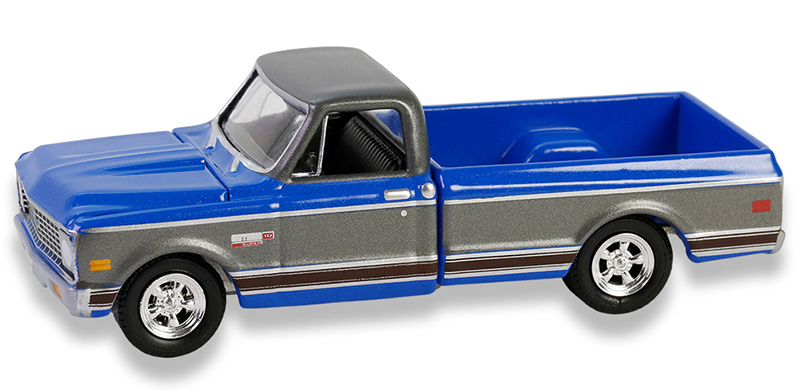 1/64 scale diecast car model of 1972 Chevrolet Cheyenne C10 Short Bed Pickup Truck Electric Blue and Gunmetal Gray Metallic "Hobby Exclusive" Series die cast model car by Greenlight. Limited edition. Brand new box. Chrome accents. Real rubber tires. True-to-scale detail. Authentic decoration. Detailed interior, exterior. Comes in a blister pack. Officially licensed product. Die-cast metal body and chassis. Dimensions approximately L-3 inches long. Manufacturer's original unopened packaging.