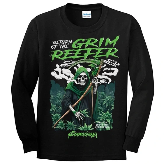Grim Reefer Long Sleeve T-Shirt. 100% cotton • Preshrunk jersey knit • Seamless double-needle 7/8" collar • Taped neck and shoulders • Rib cuffs • Double-needle bottom hem • Transitioned to sideseam in 2020 • Classic fit