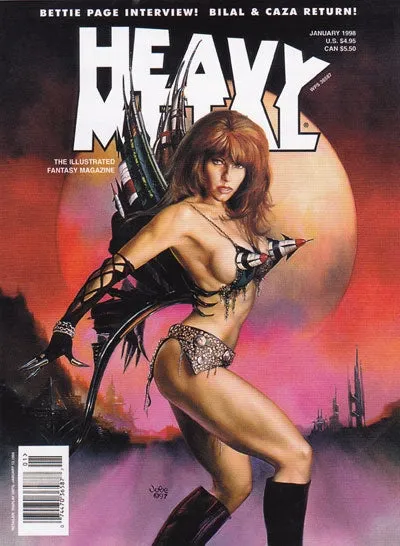 Bettie Page interview! Bilal! Caza! Cover - "Torpedoes On Planet Pink" - Julie Bell "Heavy Metal" - Kevin Eastman "Dialogue: Letters To The Editor" "Gallery: Stacy E. Walker" - Barry Morgenstein, Boris Vallejo, and Julie Bell "Dossier: Jeffrey Goldsmith Interviews Bettie Page" "Meli-Melo" - Olivier "O'Groj" Grojnowski "Juan Buscamares: The Water" - Félix Vega "The Land Of Azor" - Enzo Troiano "Ffuck Kompany" - Željko Pahek "Wind" - Philippe "Caza" Cazamayou, Philippe Kilian, and Scarlett Smulkowski "The Inheritance" - Alfonso Azpiri "Mamba: Have You Ever Been Seduced?" - Ignacio Molina and José González "New York, 2000 AD." - Enki Bilal