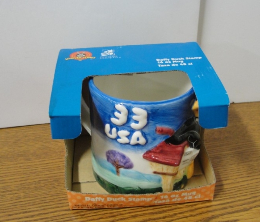 Produced by Gibson, the Looney Tunes Daffy Duck Stamped 16 ounce mug features Daffy by his mailbox, raised ceramic with bold coloring.