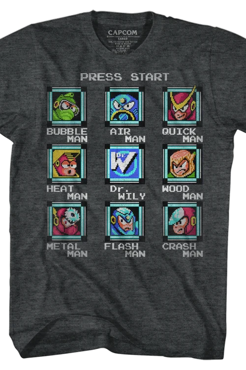 This Mega Man t-shirt features the Start Screen with the following character boxes: Bubble Man, Air Man, Quick Man, Heat Man, Dr. Wily, Wood Man, Metal Man, Flash Man, Crash Man.
