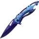 Assisted opening. 4.75" (12.07cm) closed. 3.5" (8.89cm) purple TiNi coated stainless blade. Blue aluminum handle. Bottle opener. Extended tang. Lanyard hole. Pocket clip. Thumb pull. Boxed.