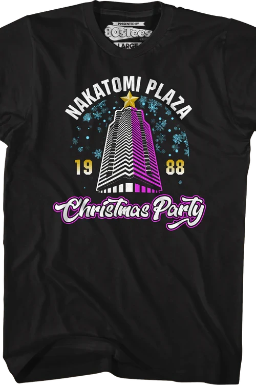An image of the Los Angeles skyscraper Nakatomi Plaza. The shirt reads Nakatomi Plaza 1988 Christmas Party.