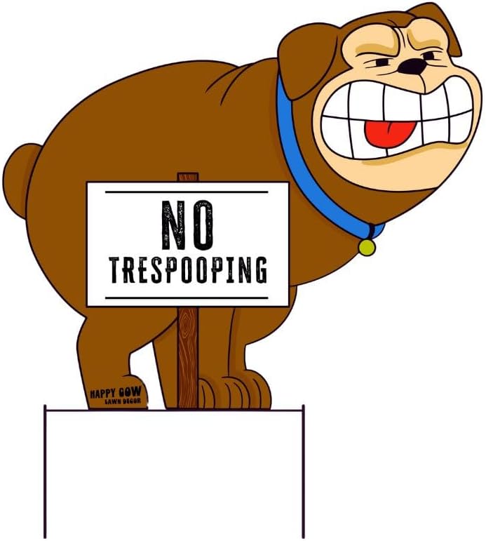 This metal lawn sign puts a new spin on the typical "no trespassing" sign. Our metal lawn sign features a cartoon pooch trying to pinch one off in front of a "no tresPOOPing" sign. This funny sign is the perfect way to add a little humor to your lawn and, hopefully, get the neighborhood dogs to stop pooping on your property. This large metal lawn sign measures 18" x 9" Details Our metal signs are made with durable, high-quality metal. They are weather-resistant. All of our lawn signs have sturdy stakes that you can easily stick into the ground. Our lawn signs feature vibrant colors and funny designs, which make them unique