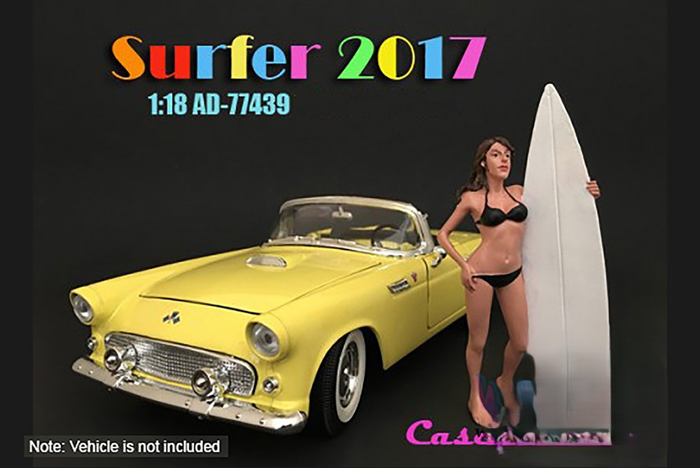 American Diorama Figurine - 1:18 scale Surfer 2017 Casey Figure w/ Surfboard in BLACK with white surfboard. Hand painted poly-resin material. This 4" long figure is great for decorating 1:18 scale cars and dioramas. Manufactured by American Diorama. Individually packed in a blister card. Card size: 5" x 8.5". Note: Vehicle is not included.