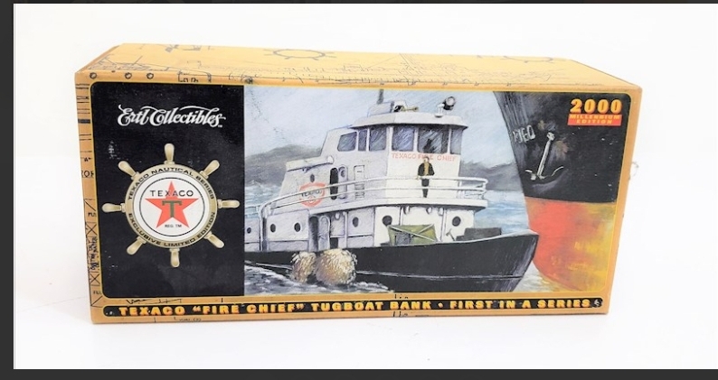 A limited edition Texaco Fire Chief Tug Boat 1:24 scale die cast used in 1967 in the New York Harbor. Produced in 2000 by ERTL, this is a rare find still in original box and never opened.