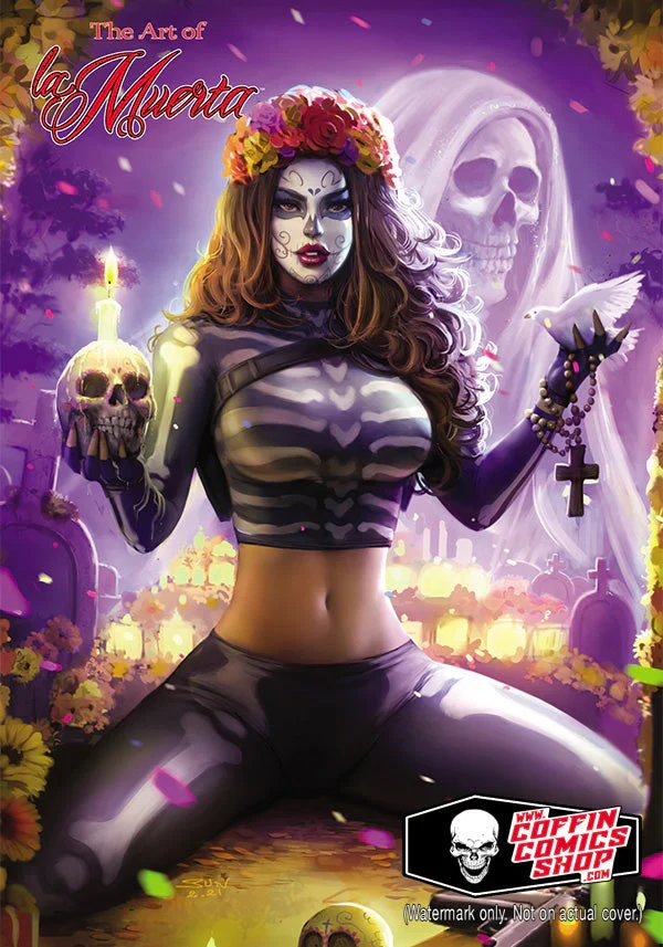 A brand-new 9x12" casebound hardcover book featuring 48 full-color pages of La Muerta pin up art by today's top artists!