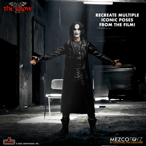 - Version 1 – The Crow wears his signature overcoat and comes with a set of interchangeable arms allowing him to recreate his iconic pose from the film, as well as an additional right pointing arm. An interchangeable smirking head portrait is included and fits on both versions of The Crow.