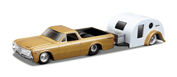 1967 Chevrolet El Camino with Traveler Trailer Gold Tow & Go 1/64 Diecast Model by Maisto